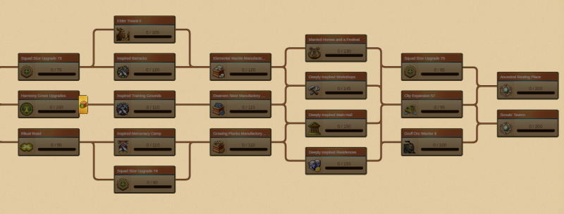 De onderzoeksboom bevat 2 uitbreidingen (56 en 57), 2 pelotonsgroottes (72,73 en 74) 1 onderzoek voor elk militair gebouw en twee voor de niveaus van woonhuizen en laboratoria.