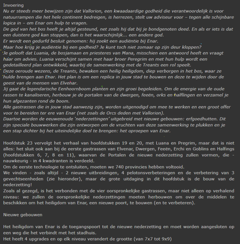 Hoofdstuk 23 biedt een pauze van het ontdekken van nieuwe bronnen en functies. In plaats daarvan leidt het verhaal je door de hoogtepunten van eerdere hoofdstukken. Naast gloednieuwe, prachtige gebouwen, moet je ook nederzettingen bouwen voor enkele van de eerdere gastrassen, zoals de dwergen, feeën, draken en halflingen.
