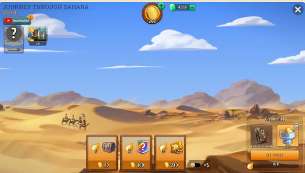 Reis door de Sahara 2025 bevat de kistmechanica, waarbij het doel is om een van de drie kisten te openen, elk met verschillende beloningen. Nadat je op de evenementbanner hebt getikt, ga je naar het hoofdevenementvenster: