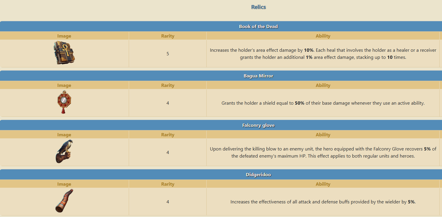 Relikwieën kunnen op helden worden gemonteerd om hun statistieken te verbeteren en hen extra vaardigheidseffecten te geven.