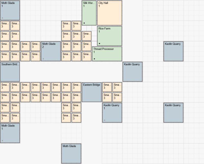 Vul deze ruimte met meer productiegebouwen, zodat je 4x Draadverwerker en 3x Zijdewerkplaats hebt. Voeg ook meer Rijstboerderijen toe. Voeg deze gebouwen toe door Kleine Huizen te vervangen, maar pas nadat je de onderzoeksboom hebt voltooid en de meeste van je werkplaatsen naar niveau 6 hebt geüpgraded. Voorgestelde indeling voor deze status: