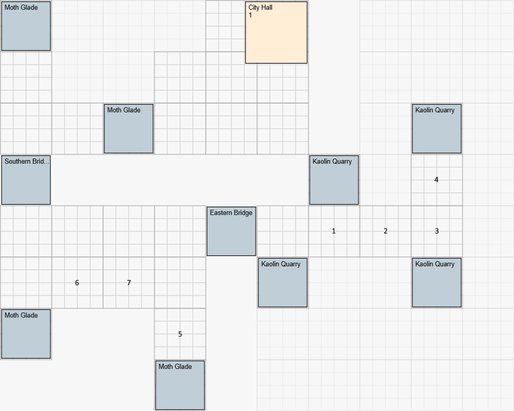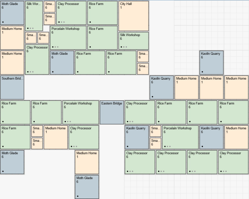 Alle kaoliengroeven zijn nu beschikbaar (begin met de bouw en upgrade ervan!) en je wereldwonder is level 13. Je kunt je nu richten op het voltooien van de onderzoeksboom en in de tussentijd meer productiegebouwen aan je stad toevoegen. In totaal zou je nu 3x draadverwerker, 2x zijdewerkplaats en 3x rijstboerderij moeten hebben. Hieronder vind je de voorgestelde indeling voor deze staat:
