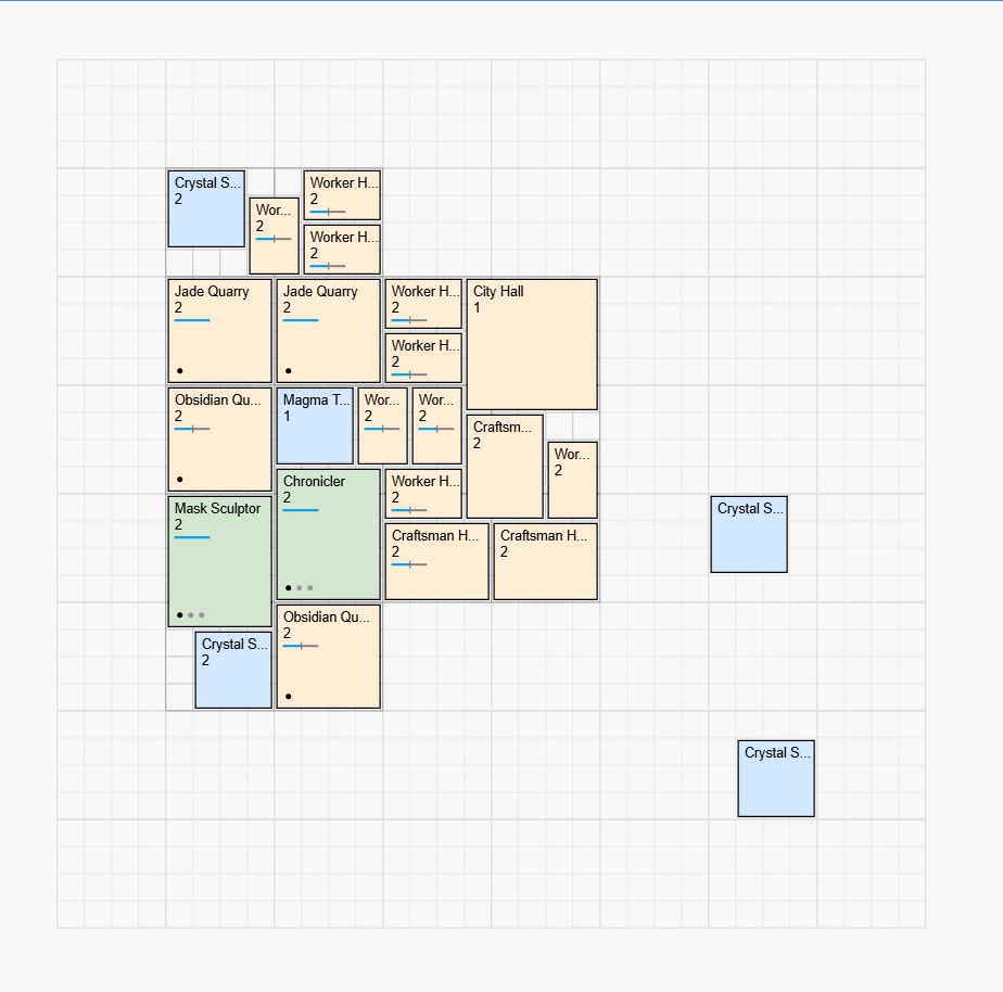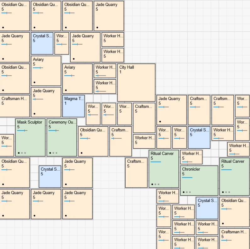 Ontgrendel de 'Rituele Dolken'-technologie en plaats vervolgens de werkplaats van de Rituele Carver, samen met een extra Jade Steengroeve en een Obsidiaan Steengroeve. De volgende lay-out toont je huidige status: