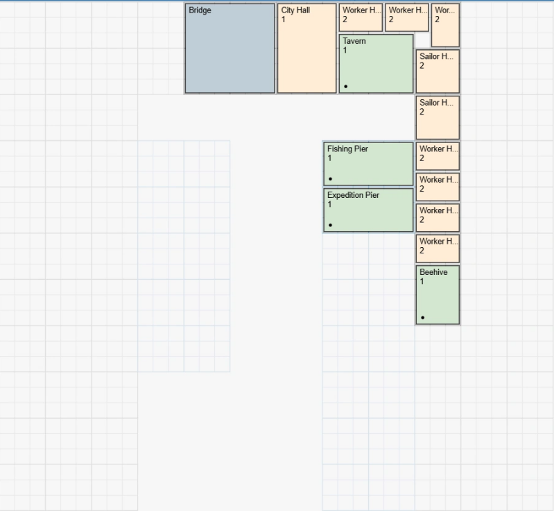 Ontgrendel de technologie 'Drijvende Netten' als laatste uit de kolom en upgrade je vissteigers naar level 3. Zodra je het Wereldwonder naar level 13 hebt geüpgraded, plaats je de uitbreidingen als volgt: