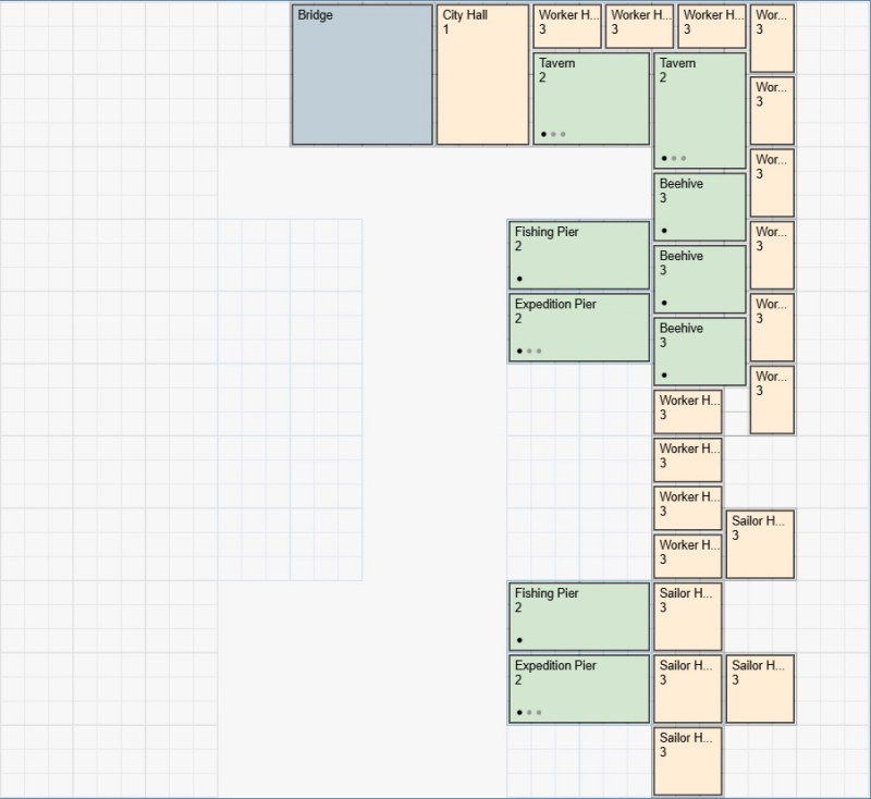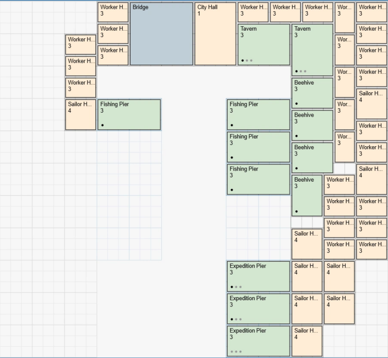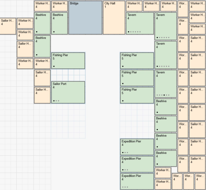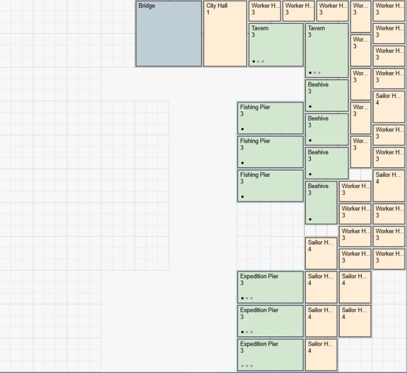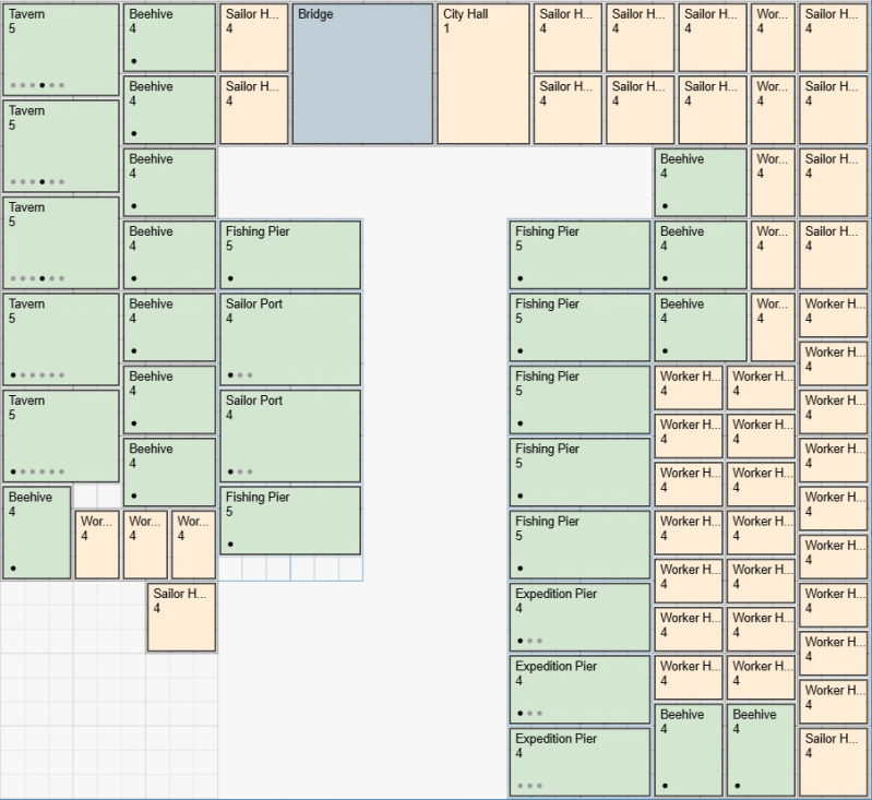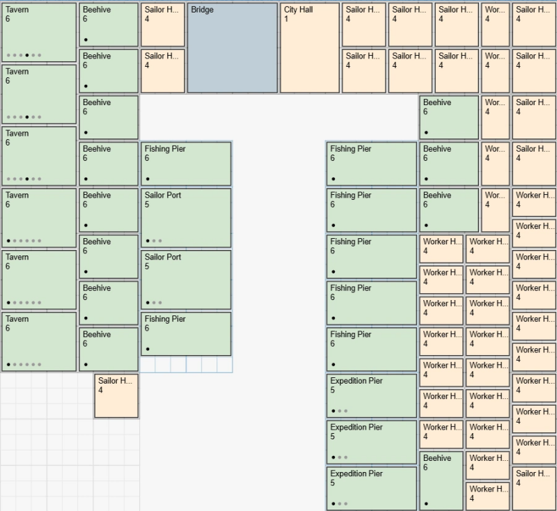 Bouw zoveel mogelijk Werkershuizen om veel Pennies te produceren. Zoek later een balans tussen Werkershuizen en Zeemanshuizen, aangezien je uiteindelijk veel Zeelieden nodig hebt om Schatten te produceren.