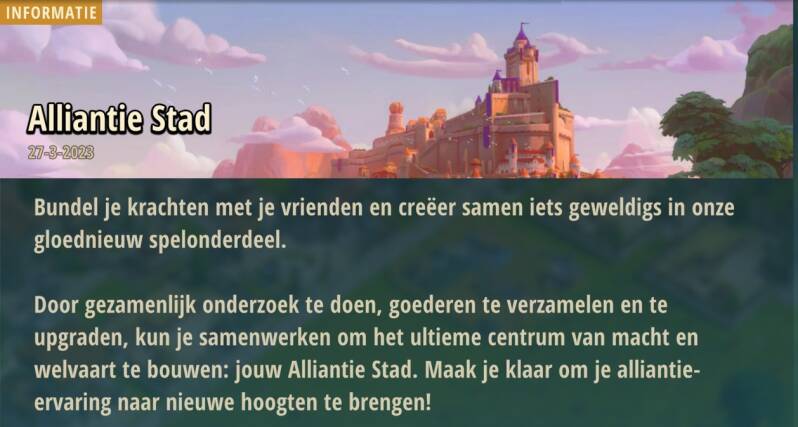 Met deze nieuwe uitbreiding wordt het nog belangrijker om samen te werken met je alliantie leden om zo samen een alliantie stad op te bouwen, waar je ook goederen en onderzoekpunten mee kan verdienen.